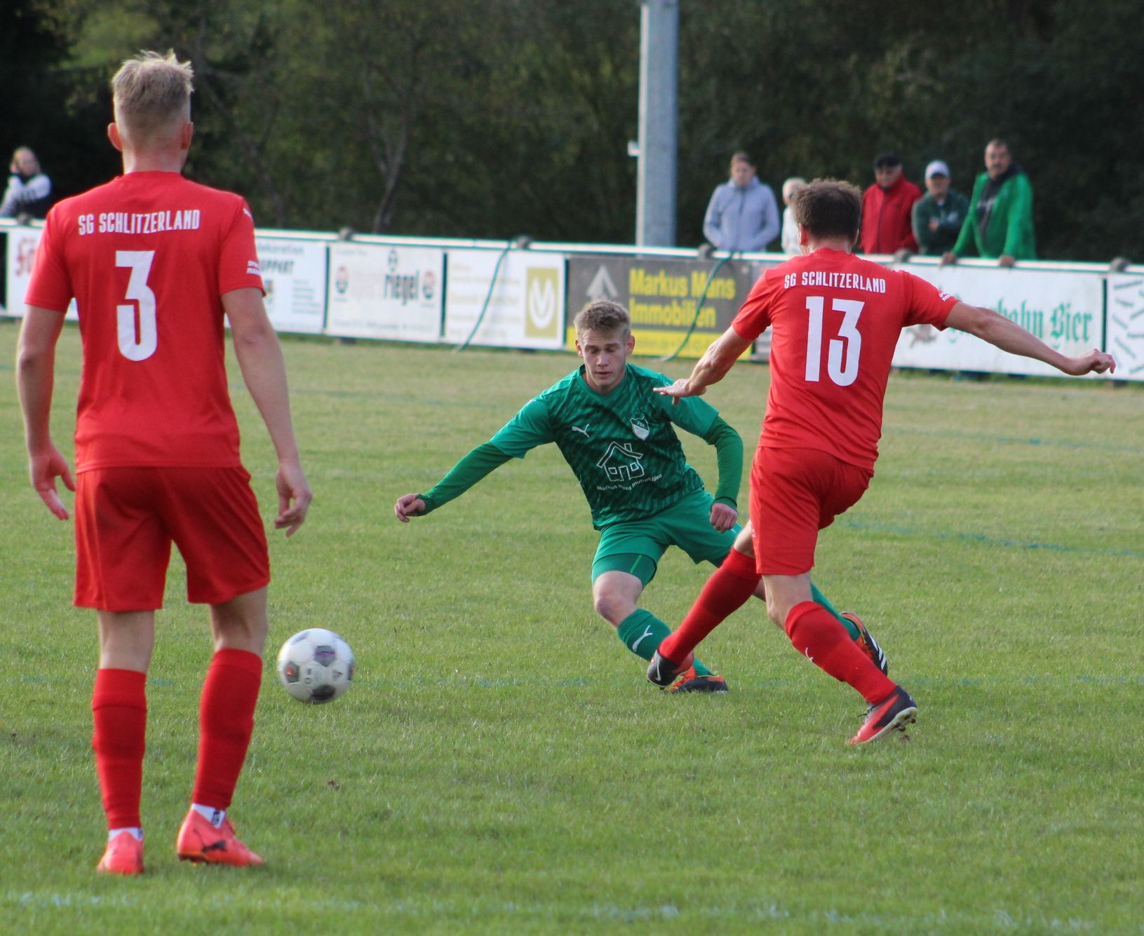 In der zweiten Halbzeit spielten die Gäste aus Schlitz offensiver und sorgten durch frühes Anlaufen für Druck beim FSV. Das Spiel wurde offener und beide Mannschaften kamen jetzt zu Abschlüssen. Eine große Chance die Führung auszubauen, erspielte sich Leonard Schlosser, der Abschluss aus 16 Metern ging über das Tor. In der 75. Spielminute erzielte die SG Schlitzerland den Treffer zum 1:1 Ausgleich. Nach einem Freistoß köpfte Johannes Heil den Ball aufs Tor, der Ball prallte vom Innenpfosten ins Tor. Florian Hofmann war dabei chancenlos. Im weiteren Spielverlauf drückten die Hausherren nochmal und versuchten durch Philip Eurich und Justus Flach den Siegtreffer zu erzielen, doch ein weiterer Treffer fiel nicht mehr. Aus dem Spiel ging kein Sieger hervor und endete in einem gerechten Unentschieden.