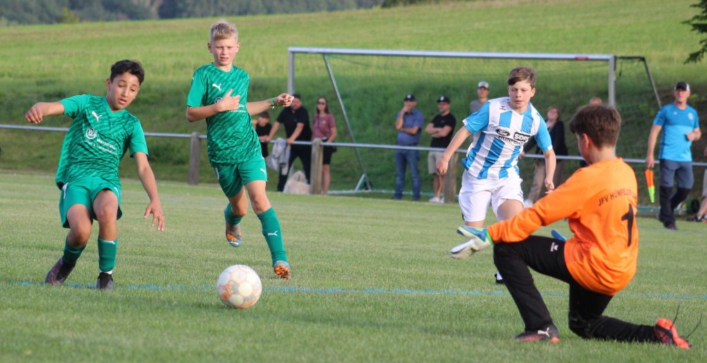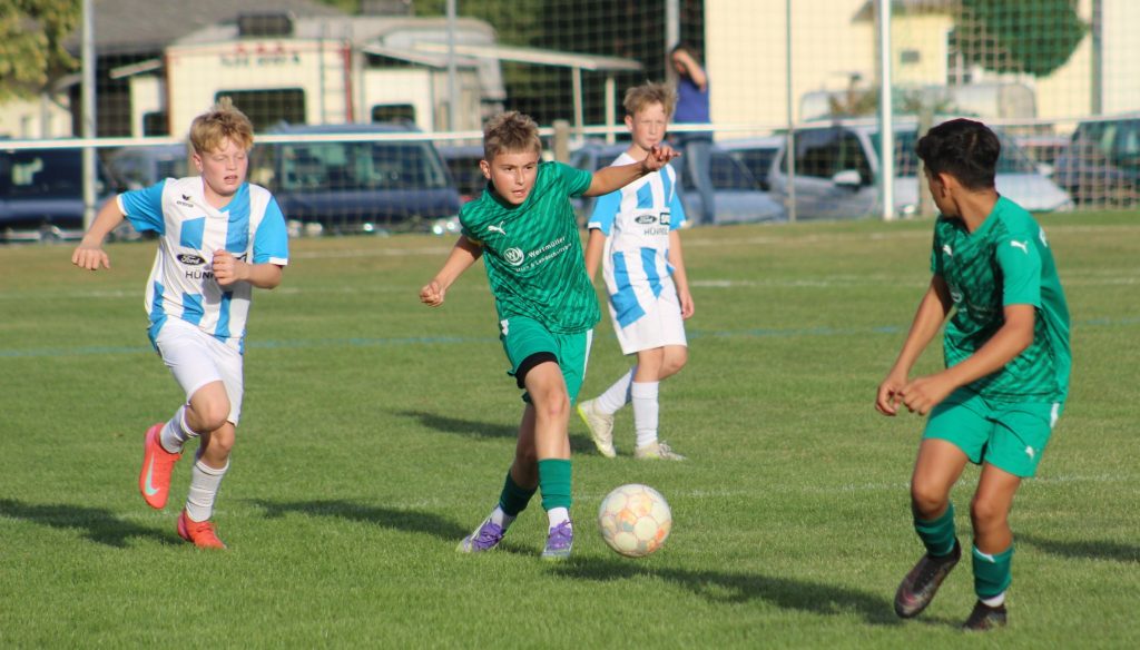 Von Beginn an entwickelte sich ein munteres Spiel mit Chancen auf beiden Seiten. Bereits in der 5. Minute brachte eine Ecke von Finn Schäfer Gefahr, doch der Gäste-Keeper war auf dem Posten. Kurz darauf sorgte Veit Schröder über die linke Seite für Wirbel und setzte Emre Ay in Szene, dessen Fallrückzieher jedoch knapp über die Latte flog.