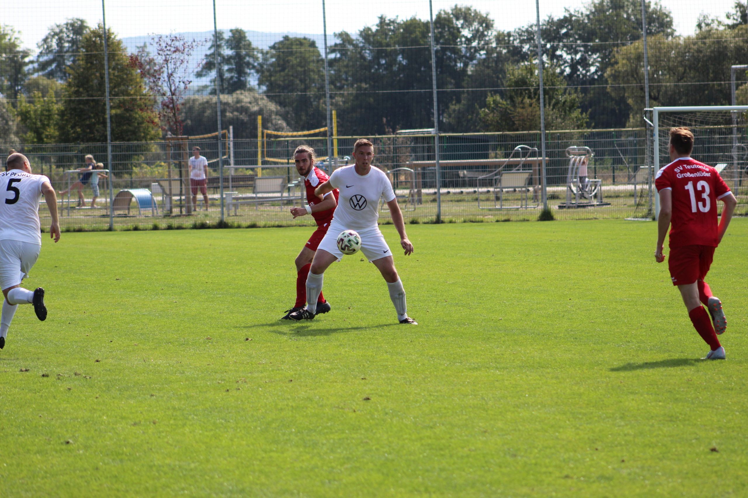 Dies sollte dem FSV wieder Sicherheit geben. Anschließend wurde der Ball gut laufen gelassen und mehrere Torchancen herausgespielt. Ein guter Angriff wurde durch einen Abseitspfiff unterbrochen, Großenlüder schaltete schnell mit einem langen Ball und überraschte damit die aufgerückte Pfordter Hintermannschaft so sehr, dass plötzlich Maximilian Heim alleine vor Paul Trabes stand und nur noch einschieben musste. Darauf folgte sofort ein weiterer langer Ball, den Paul Trabes an der 16er Kante falsch einschätzte und die Gäste aus dem Nichts den Ausgleich erzielen konnten.