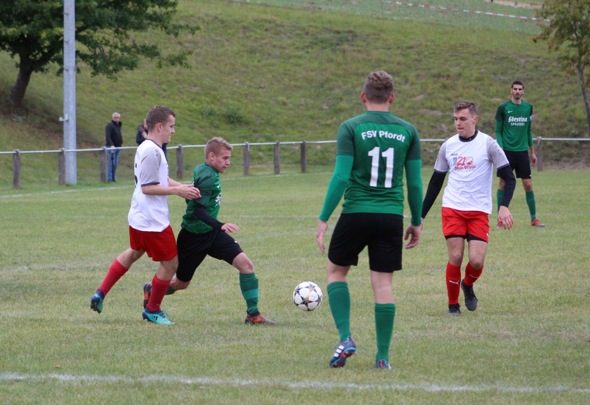 Kurz danach war der FSV leicht überfordert und hatte Glück, dass weitere Schüsse nur an Pfosten und Latte landeten. Nach etwas mehr als 20 Minuten sollte der FSV dann auch mal Glück haben, als ein langer Diagonalball gespielt wurde, der Gästetorwart aus seinem Tor kam, der Abwehrspieler per Kopf den Ball jedoch ins eigene Tor bugsierte.