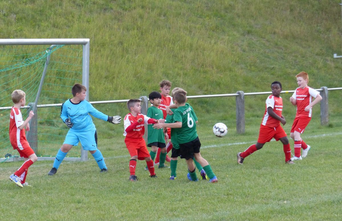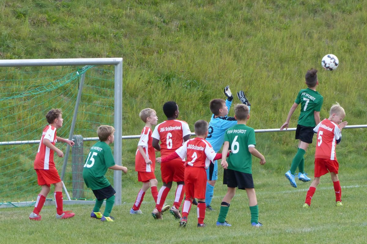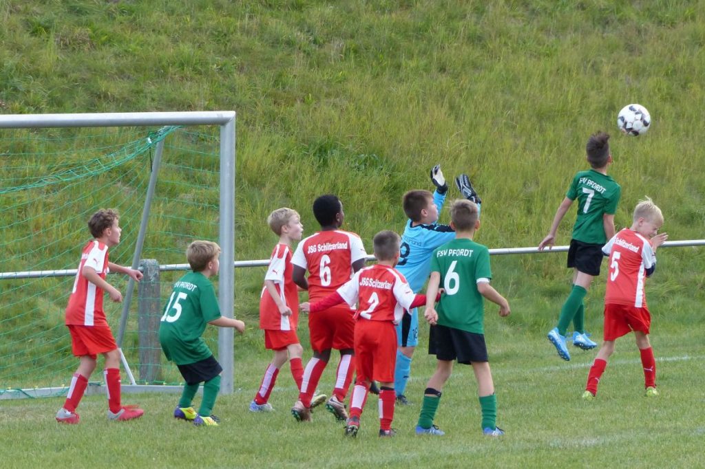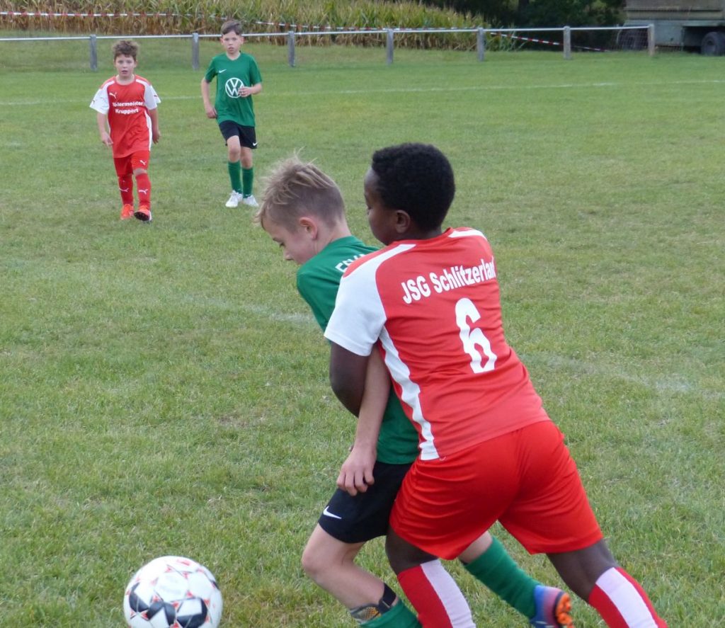 Das Spiel begann mit Chancen auf beiden Seiten. In der dritten Minute konnte der Keeper der JSG einen Schuss von Ben Mattern parieren und nur eine Minute später köpfte ein Schlitzer Angreifer den Ball nach einer Ecke knapp über das Tor.